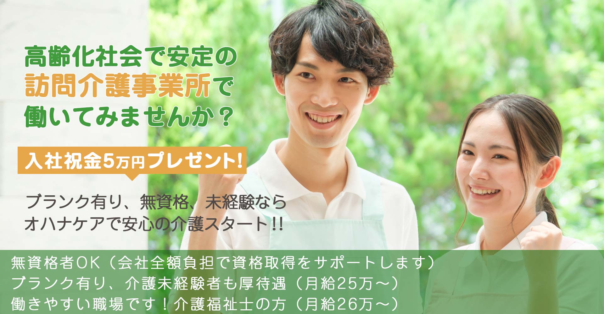 介護未経験者、ブランクありの方等には、オハナケアは絶対にお勧めです。なぜなら、無資格介護未経験の状態から、オハナケアの支援のもと、資格をとり介護を始めたスタッフが多数いるからです!これから介護を始める方にとっては、経験者を優先的に採用する会社にはない、安心感がオハナケアにはあると思います。