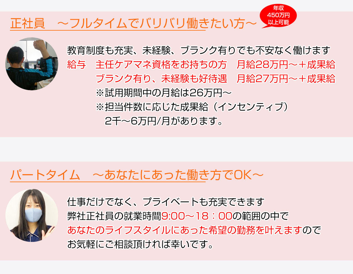 社会保険完備、交通費全額支給(上限2万円/月)、昇給・賞与(実績有)、産休・育休(実績有) |