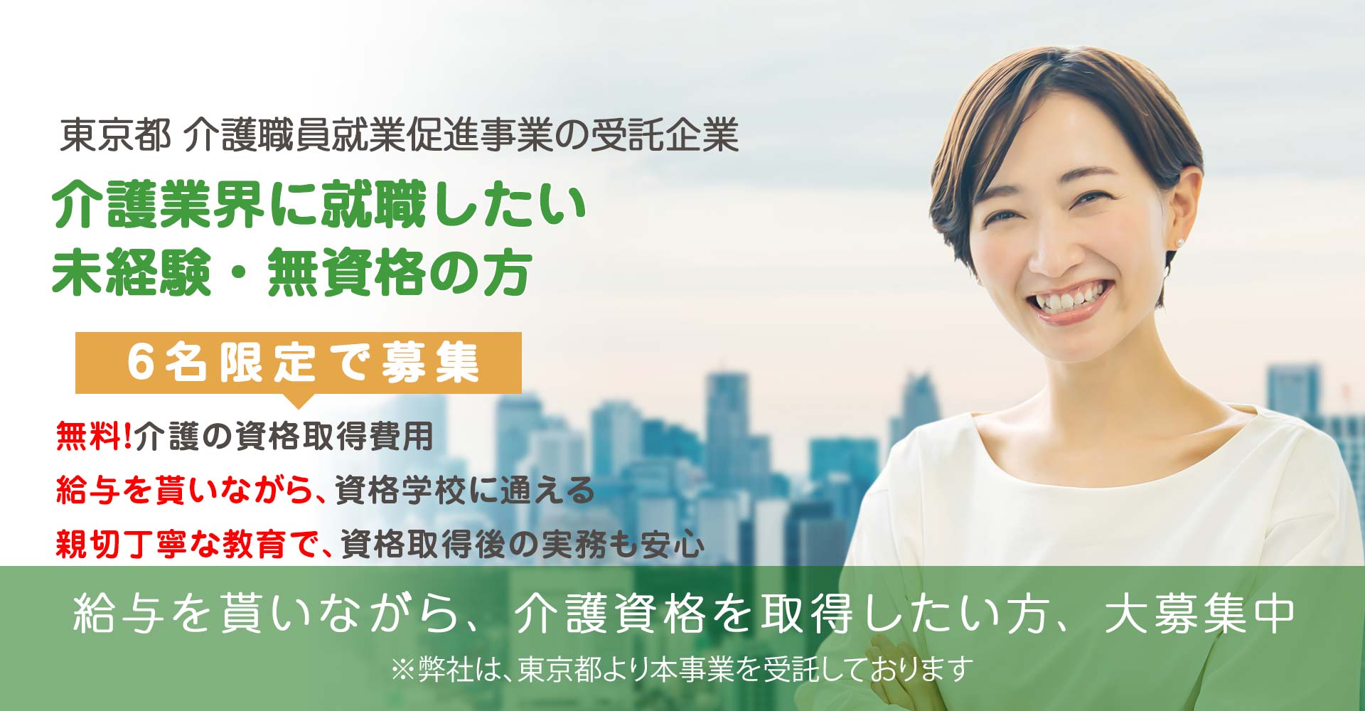 具体的には、介護業界への就労を希望する主婦、就業者、既卒者及び離職者等に、本事業の委託を受けた指定の介護事業所等(弊社)で働き(給与を貰い)ながら、介護資格を費用負担なく取得してもらうことが出来ます。